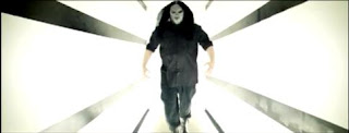 Corey thinks he is looking in a mirror, as Paul begins to mimic all of his movements. As he waves towards the 'reflection', Paul waves with the wrong hand, showing it really isn't a mirror Corey is looking at. Suddenly, Paul bashes his fists against the 'mirror'. By doing this, this could either show that, like the last room, it is trying to say he doesn't belong here, or by going by how it seems that Paul is inside of Corey, it could be as if Corey is beating himself up over something. This could also reflect real time evnts, showing conflicts in the band. Quick cuts are used throughout this sequence, which also could be used to represent Corey's confusion and fear about being stuck in a room of mirrors.
